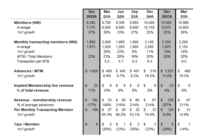 To charge such APR’s, DAVE makes tipping “optional.” Members have wised up to the tip scheme and users stop tipping over time. In Q1 2024, tips revenue grew only 8%, while processing fees and advances grew 35%. Tips per member fell 14% year-over-year.